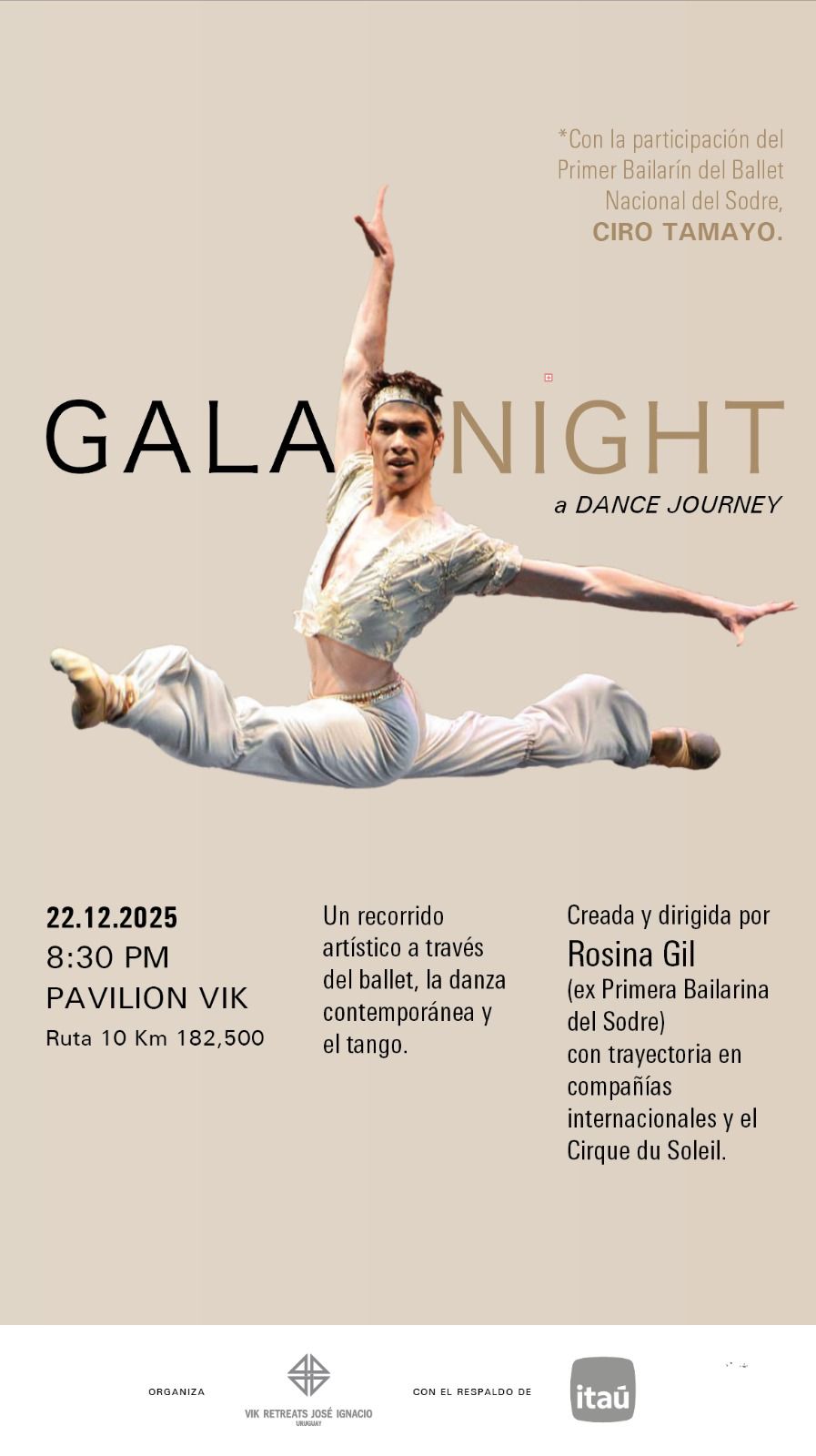 Presented for the first time in José Ignacio at the Pavilion Vik, the performance features Ciro Tamayo, Principal Dancer of the National Ballet of SODRE (BNS), as well as a striking Cyr Wheel act performed by Mateo Vega, completing a truly unique multidisciplinary experience.